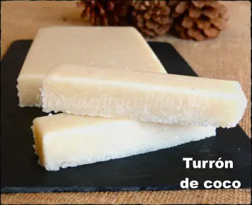 - Turrón de coco: contiene coco rallado en gran cantidad. Es una de las variedades más antiguas de entre las «modernas», es decir, aparte del turrón duro y blando de almendras o avellanas.
