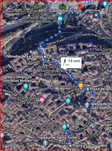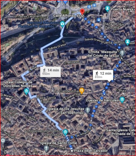 Si sabes moverte por Toledo con más o menos soltura, hay variedad de alternativas. Es como saber encontrar la salida del laberinto. En mi caso, tal vez por eso de que los toledanos somos un poco testarudos y en ocasiones vamos a lo seguro y sin aventurarnos, mi opción sería llegar hasta la plaza Tendillas por la calle Alfonso XII, desde ahí seguir por Calle Tendillas, bajar por calle de La Meced, bordear el edificio de la Diputación, y llegar hasta las escaleras mecánicas