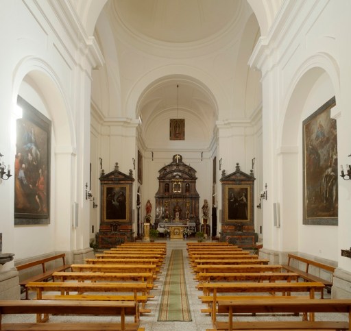 Aunque el crucero de la iglesia, en su desarrollo lateral, sobresale ligeramente en planta, no puede hablarse de cruz latina; aquella es rectangular, de una sola nave dividida en tres tramos: el mencionado crucero, la capilla mayor y el coro, en alto, a los pies, sobre amplio arco rebajado.
