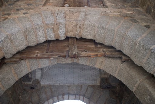El acceso a través de esta puerta debió realizarse por sendos arcos de herradura, que fueron modificados posteriormente hasta convertirlos en arcos de medio punto, sobre los que se sitúa el cuerpo superior que servía como estancia, distinguida externamente con el típico aparejo toledano.