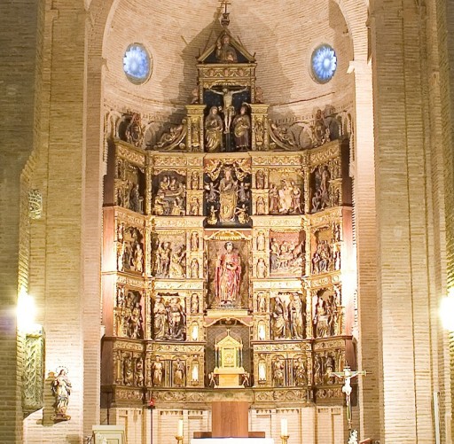 Retablo del Altar Mayor realizado por Juan de Tovar y Fco. de Espinosa entre 1.545 y 1.548, de estilo plateresco. En él se aprecia en la calle central (de abajo hacia arriba): el Sagrario -obra del orfebre Tasio-, la talla del apóstol Santiago con el atuendo de peregrino -obra de Copín de Holanda- , la Virgen de la Asunción, la escena del Calvario con María y San Juan al pie de la cruz y por último la figura del Dios Padre. En el banco, medallas y molduras, y en el remate superior dos figuras femeninas.