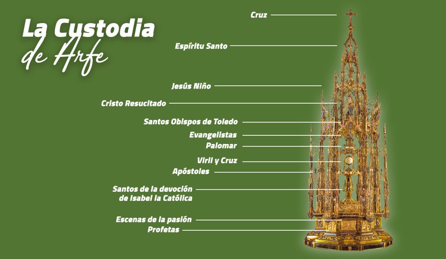 La Custodia de Arfe, sale a la calle por la Puerta Llana de la Catedral Primada para ser expuesta con motivo de la celebración del Día del Corpus Christi. Toledo se engalana con flores, reposteros, adornos y mantones para vivir, su fiesta principal, el Corpus Christi, y poder ver de nuevo la Custodia de Arfe. Si la procesión empieza a las 11:00, la Custodia suele salir de la catedral en torno a las 11:45-12:00. Regresa a la catedral a las 14:00-14:15