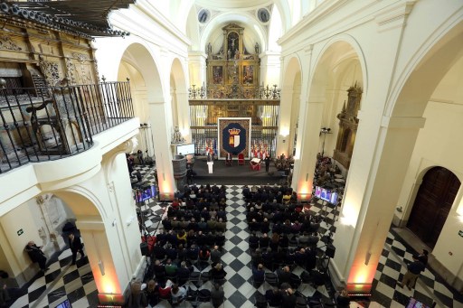 Interior de la iglesia, vista desde el coro alto. Comenzó a construirse en 1605 con trazas de Nicolás de Vergara el Mozo, prosiguiendo las obras Juan Bautista Monegro. Su planta consta de tres naves con coro en alto y presbiterio plano con dos capillas laterales. Las naves se separan por tres arcos con pilastras dóricas que sostienen el entablamento encima del cual se levanta una bóveda de cañón. El crucero se cubre con una cúpula de media naranja sobre pechinas.