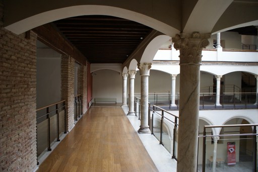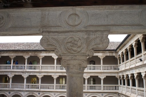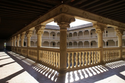 -El claustro Real o de los Generales. Consta de tres pisos enteramente construidos en piedra. El piso bajo está compuesto por arcos de medio punto que descansan sobre columnas. Los elementos arquitectónicos empleados-espejos de pizarra en las enjutas, balaustres, etc., son los usuales en Covarrubias en otras obras del momento. Se accede desde la calle de San Pedro Mártir, que antiguamente era la entrada principal. En un lateral, se hallaba un brocal de pozo del año 1032 procedente de la Mezquita Aljama, ubicada en el Claustro de la Catedral, que está grabado alrededor con caracteres arábigos. Allí existió hasta 1872 que fue trasladado al Museo de Santa Cruz. (Fuente: Wikipedia