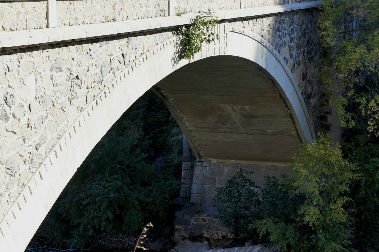 Al elegirse un punto donde el cauce circula angosto se prescindió de una estructura larga que salvara el río con varios arcos y se ajustó una rasante muy baja con respecto a los muros rocosos de ambas márgenes. La longitud total de la obra es de 79 metros, incluido estribos. En extremos se levantaron fuertes muros asentados sobre roca viva con contrafuertes. Dispone de un solo arco escarzano con luz de 43,30 metros que apoya en las basas de estribos sobre salmeres sobresalientes