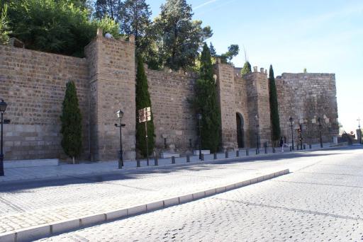 Fachada de la Puerta de Alcántara. Consta de un vano con arco de herradura flanqueado por dos torres cuadradas. El aparejo utilizado consiste en piedra de sillería reaprovechada de épocas anteriores (visogoda o incluso romana) en las zonas bajas y las verdugadas de ladrillo de origen mudéjar (alternancia de mampuesto y ladrillo) en las partes medias y altas. Las esquinas y los merlones están realizados enteramente en ladrillo, también aparejo mudéjar