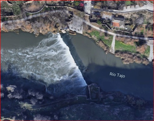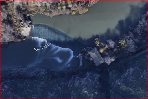 En este punto, si miramos hacia la orilla opuesta del río Tajo, podemos ver los restos (la base) de la central hidroeléctrica de Romayla la Nueva, construida en 1915 sobre los restos de un antiguo molino harinero. Del edificio de Romayla la Nueva nada queda hoy, salvo la base, convertida en mirador sobre el paso de agua que movía sus turbinas