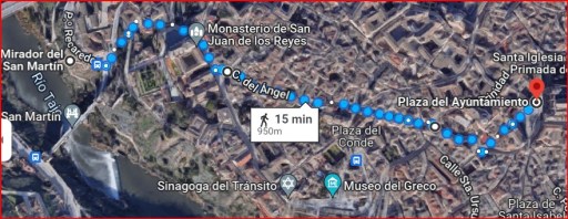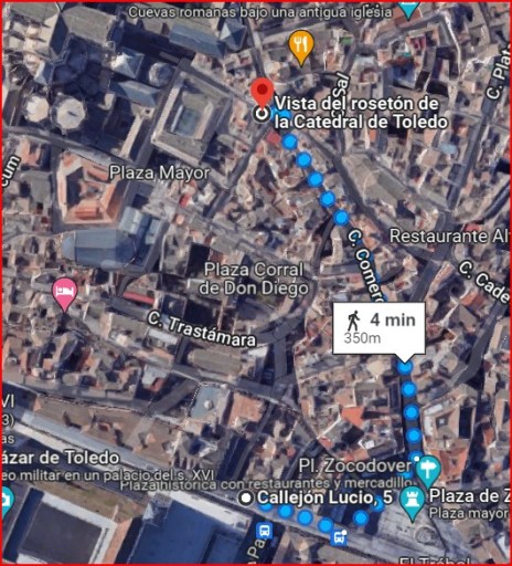 Desde allí no tiene más que bajar hasta la plaza de Zocodover, cruzar la plaza y seguir el paseo por la calle Comercio (Calle Ancha), hasta la plaza de Cuatro calles (Que, en realidad, son cinco) y si la baja por la calle de Chapinerías y la puerta del Reloj está cerrada, pues no tiene más que bordear el edificio y probar suerte en las otras puertas.