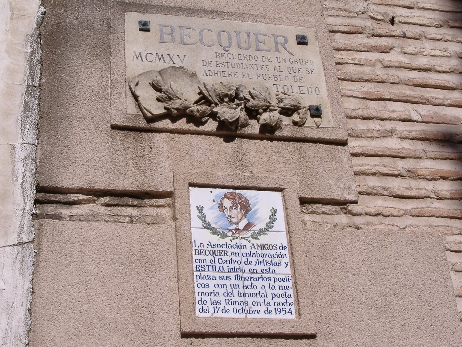 En una placa cita así «La Asociación AMIGOS de BECQUER, en colaboración con el Centro de Artistas y Estilo, inició en esta plaza sus itinerarios poéticos con un acto a la memoria del inmortal poeta de las Rimas, en la noche del 17 de octubre 1954.