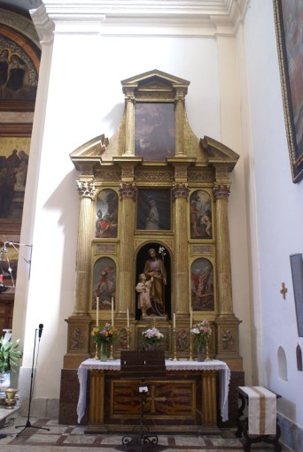 La portada de la fachada principal de la iglesia se contrató en 1651, según trazas de arquitecto carmelita descalzo, fray Pedro de San Bartolomé. Es de piedra, del tipo retablo -cuerpo y ático con hornacina-, con soportes en forma de pilastras toscanas.