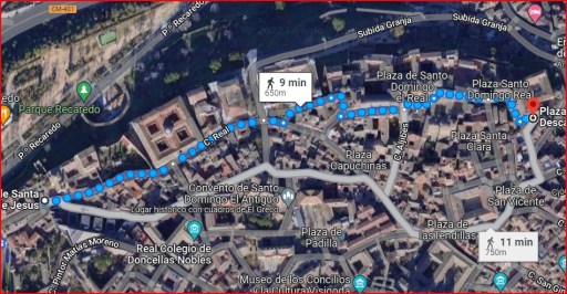 Callejeando un poco se puede llegar desde la plaza de Santa Teresa hasta la plaza de los Carmelitas y con la excusa volver a pasar por el cobertizo de Santo Domingo El Real, así descubrir uno de los incontables y desconocidos atajos que tiene esa ciudad para no pasar de manera obsesiva siempre por las mismas calles. Gracias a estos atajos es como uno se pierde o comprueba lo cerca o lejos que se encuentran los distintos rincones de la ciudad