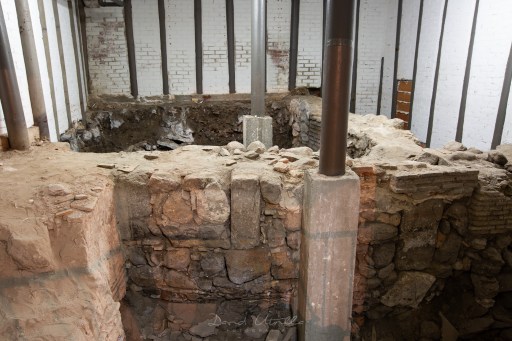 En la planta inferior, que da a la calle de Tornerías, se encontraron unos depósitos de agua romanos con arcos de medio punto de granito, o eso se creía hasta el 2018, que en su rehabilitación se han encontrado unos hallazgos sorprendentes…