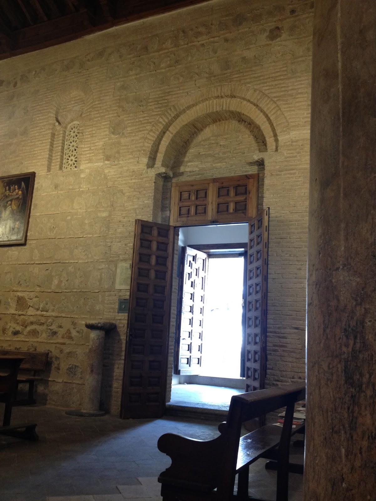 Aunque exteriormente la iglesia es bastante normalita, su interior mozárabe conserva los primitivos arcos de herradura que descansan sobre columnas con capiteles visigodos. La iglesia apenas cuenta con imágenes, cuadros y otros elementos decorativos, tan solo una pila bautismal de piedra (diría que la original) que nos recibe junto a la entrada y una corona votiva (una de las principales ofrendas de carácter permanente que desde la época Constantina se hacían a las iglesias para honrar a Dios) que nos recuerda su pasado. Sin embargo, en este caso concreto esa falta de decoración lejos de restarle encanto, se lo dan, ya que nos ayuda a hacernos una idea mucho mas clara de como era esta construcción en sus orígenes. Esta iglesia data del S.XXI y es una de las pocas iglesias (concretamente 6) a las que el rey Alfonso VI permitió continuar empleando el rito Hispano-mozárabe, rito que hoy en día se puede seguir escuchando todos los domingos a las 12:00.