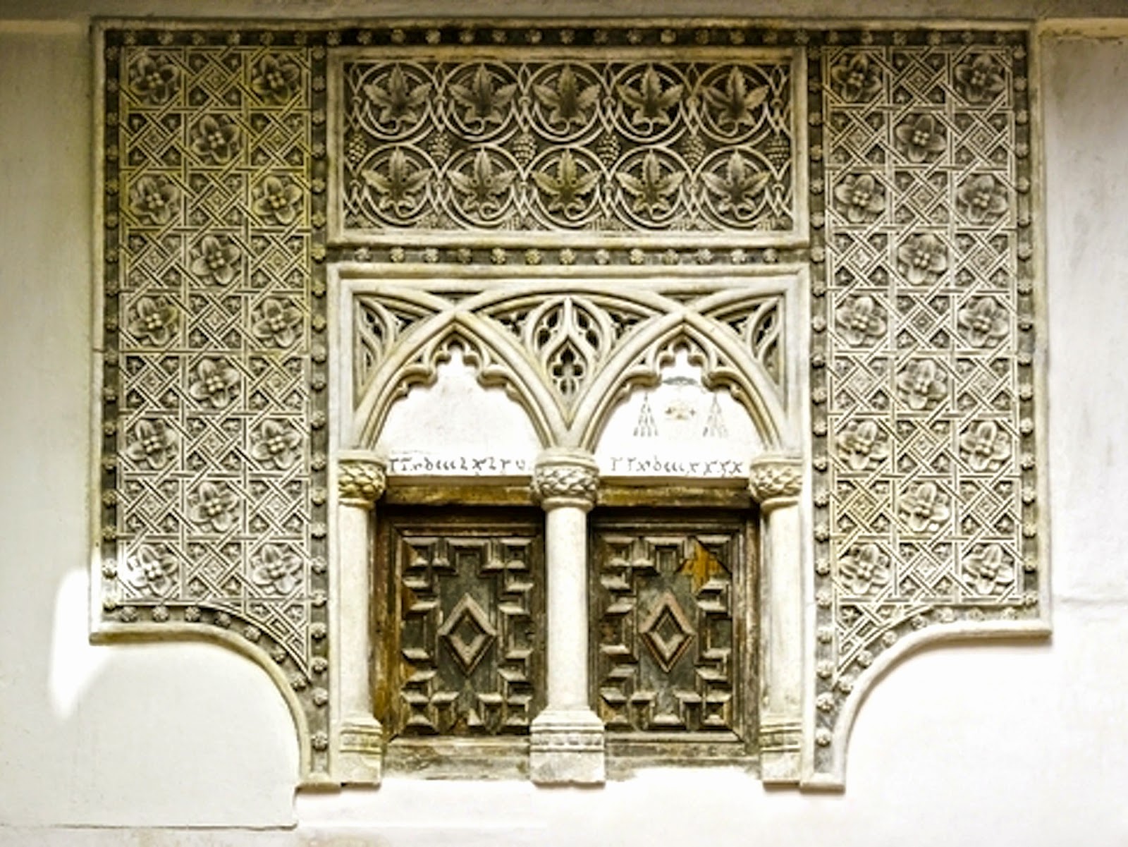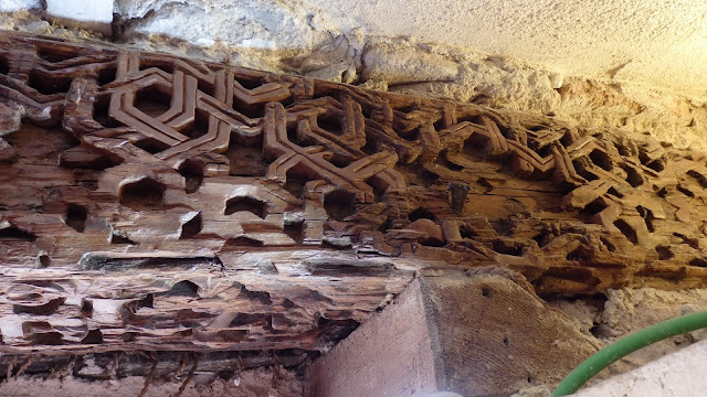 Un elemento de gran relevancia para su estudio arqueológico es una pieza de madera utilizada como dintel de acceso al sótano, donde se puede observar el trabajo de tallado con motivos florales, a base de tímpanos y roleos, acompañando un repertorio epigráfico cuya transcripción dice: