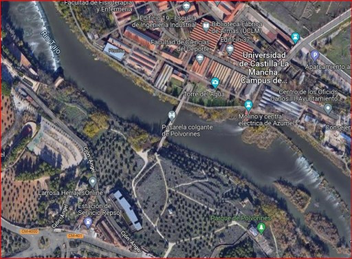 Este puente comunica el Campus Universitario de la Fábrica de Armas con la zona conocida como “la Olivilla”. Aquí, en el siglo XX, llegó a existir también una pasarela que, a día de hoy, no se conserva puesto que una riada se la llevó por delante en el año 1947.