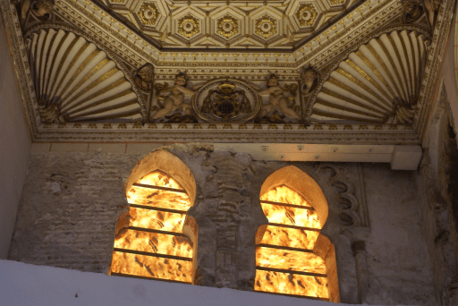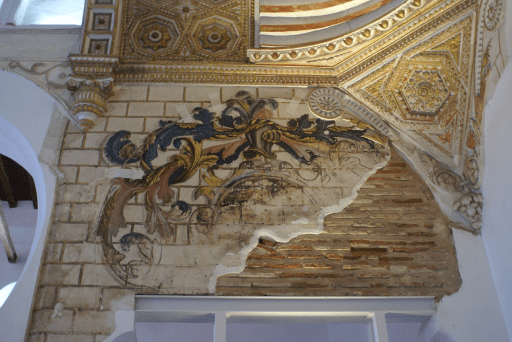 Los treinta y dos pilares de este templo son de ladrillo recubierto por cemento y cal. Ornados de piñas y volutas, sus capiteles denotan influencia del arte románico. Por encima de los arcos de herradura prevalece la ornamentación abstracta en frisos horizontales que incluye molduras con delicados motivos basados en la interacción de líneas y medallones. Los entrelazados geométricos formados por las líneas son de origen almohade.