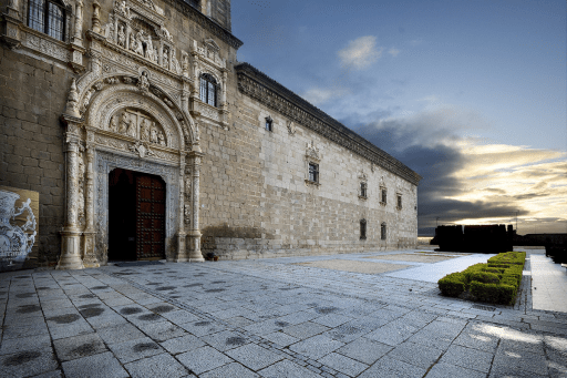 El edificio fue construido en las primeras décadas del siglo XVI, tras la muerte de su fundador, y constituye una de las obras arquitectónicas maestras del Renacimiento español. Tiene planta de cruz griega con dos pisos, un gran crucero central abierto a ambos pisos y un total de ocho crujías, más otra sala encima del zaguán, todas ellas cubiertas con techumbres de madera. Cuenta, además con dos patios claustrales dispuestos entre sus brazos.