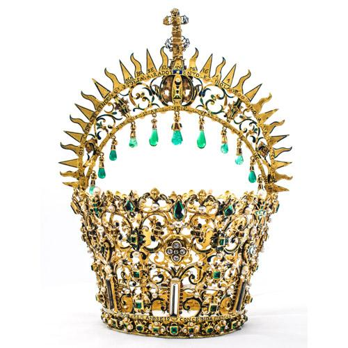 Corona en forma de cestillo calado, de gran riqueza y cromatismo, decorada con roleos, tornapuntas, piñas, motivos florales y querubines, todo ello cuajado de esmaltes de colores, pedrería y perlas naturales. La diadema que remata la pieza se decora, además, con esmeraldas colgantes.