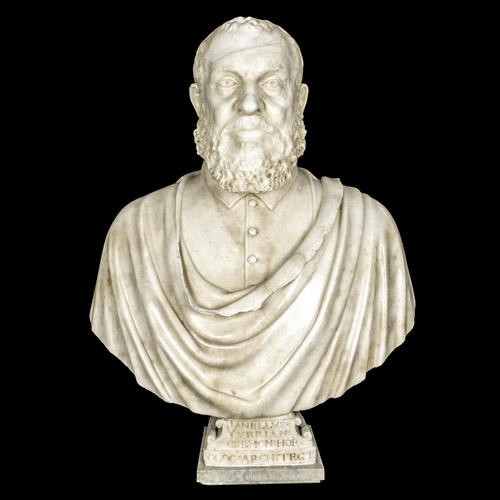Retrato en busto de Juanelo Turriano, insigne relojero e ingeniero italiano, nacido en Cremona hacia 1500 y fallecido en Toledo en 1585, que trabajó al servicio de Carlos V y Felipe II y que construyó en Toledo su célebre Artificio, un prodigioso ingenio para elevar el agua del Tajo al Real Alcázar.