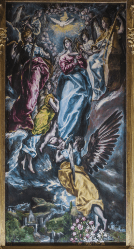 Se trataba del testamento artístico de uno de los grandes genios de la pintura universal, Domenikos Theotokopoulos ‘El Greco’ (1541-1614), una Inmaculada Concepción, confundida durante años con la Ascensión debido al intenso movimiento vertical de la composición y su dinamismo, realizada entre 1608 y 1613 por encargo de doña Isabel de Oballe, dama toledana acaudalada que había hecho fortuna en Perú, para su capilla personal en la parroquia de san Vicente Mártir de Toledo.