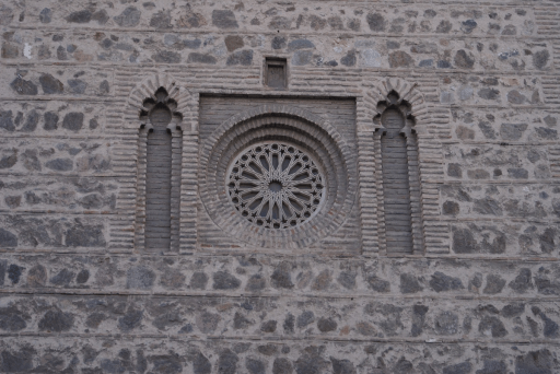 Sin embargo puede ser que pase más inadvertido una original fórmula que algún artista utilizó en la Iglesia de Santiago el Arrabal. ¿Alguna vez te has fijado en un recuadro que existe sobre el óculo de la fachada norte, tras la Puerta de Bisagra?