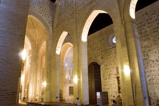 El templo posee tres naves (la central de mayor altura que las laterales), divididas en tres tramos, separadas por grandes arcos apuntados y cubiertas con armadura de madera. El crucero sobresale en planta y está cubierto, en su parte central, por una bóveda de crucería en ladrillo. El artesonado central está formado por vigas de par y nudillo, con tirantes dobles con fragmentos de inscripciones en árabe cúfico y nasji.