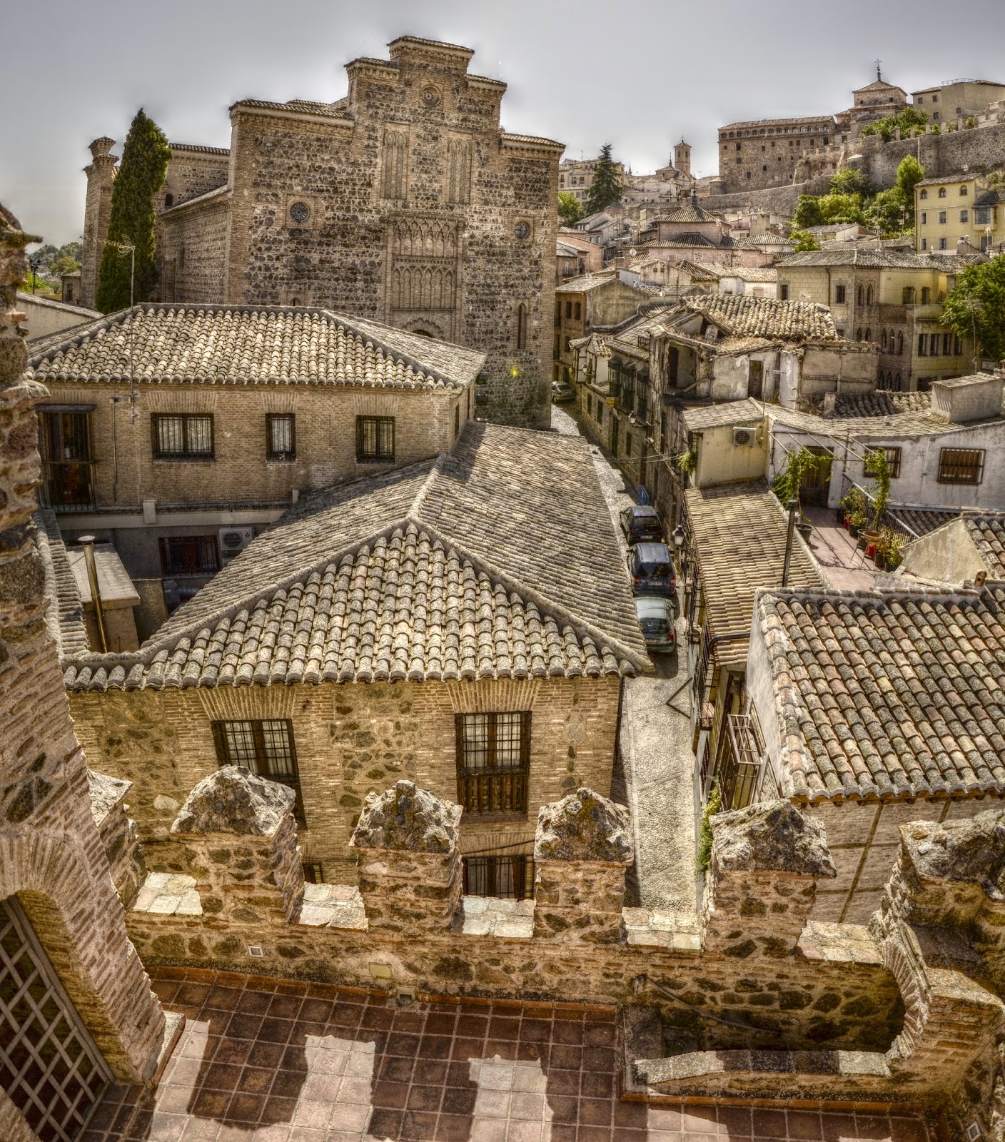 Entre las almenas, los rosales trepadores en florescencia; los árboles frutales, los eucaliptos, los del paraíso y las acacias en flor, rodean el palacete del cardenal Lorenzana, embalsamando el ambiente con un perfume enervante de viejas esencias. Parece como un carmen de Granada, la mora, trasladado a Toledo, la levítica.