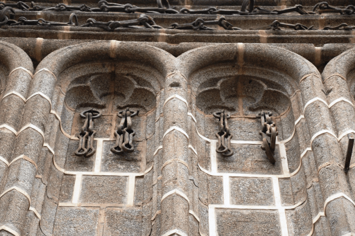 Estos elementos arquitectónicos recorren la parte superior de la iglesia y el claustro, confiriéndole un aspecto característico al templo y estilizando sus formas. También se puede ver, en la parte inferior, las franjas epigráficas con caracteres góticos loando los éxitos de las campañas militares de los Reyes Católicos.