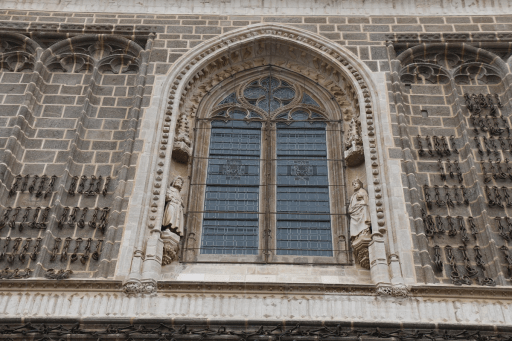 Está formado por un arco apuntado (ojival), ajimezado (dividido en dos), decorado con tracería cuatrilobulada y en el interior una vidriera. Sus jambas están decoradas con figuras con peana y dosel, labor de cardina a base de elementos vegetales y puntas de diamante de tradición románica. En la franja epigráfica inferior se puede leer: NO A NOSOTROS SEÑOR SINO A TU NOMBRE DA LA GLORIA-
