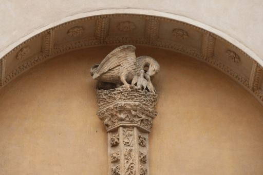 La actual puerta de acceso al visitante está coronada por un impresionante grupo escultórico de arte hispano-flamenco, que algunos creen se realizó para decorar la capilla mayor, bajo un arco sobre el retablo que hoy acoge la pintura de Romero Carrión: María Inmaculada y la orden franciscana. Se trata de un Calvario en el que la cruz, flanqueada por la Virgen y San Juan, es un Árbol de la Vida. Curiosamente, en su cima anida un pelícano, ave que, según la sabiduría popular, cuando carece de alimento, se pica el pecho para alimentar con su propia carne y sangre a sus crías. La sentencia moral derivada de tal acto fue destacada por el Physiologus, libro compilado en Grecia por un autor desconocido, en el siglo II A.C. y que fue trasladado al latín sobre el año 400, influyendo decisivamente en los bestiarios medievales, en los que el pelícano aparece claramente como imagen de la Eucaristía: Cristo por salvar a la humanidad entrega su carne, su sangre y hasta su propia vida.