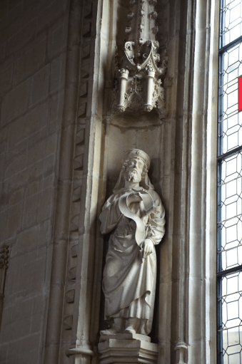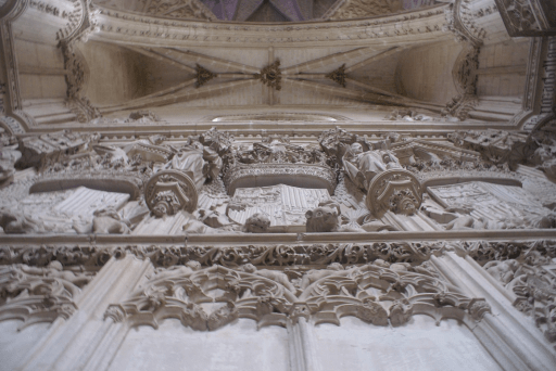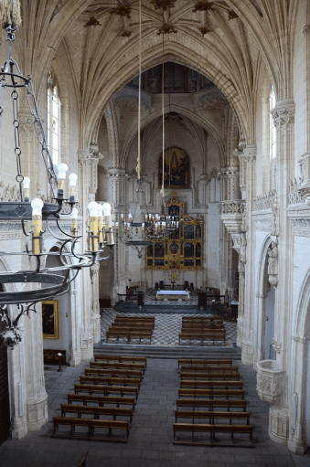 En la parte superior de la imagen se puede apreciar el claristorio que está constituido por enormes ventanales apuntados (ojivales) que cobijan tracerías flamígeras.