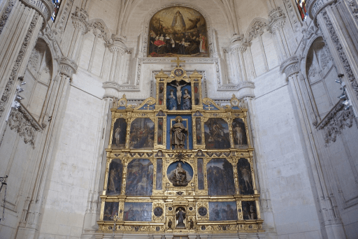 El retablo actual procede del Hospital de Santa Cruz, hoy en Museo Provincial de Bellas Artes, promovido por el cardenal Mendoza a comienzos del siglo XVI. Obra del escultor Felipe Bigarny y del pintor Francisco de Comontes de mediados del siglo XVI y por tanto, contemporáneo del monasterio. Representa episodios de la Pasión, Anástasis o bajada a los Infiernos y Resurrección, además de contener dos originales escenas procedentes de la Leyenda de la Santa Cruz, popularizada en el siglo XIII por el dominico Santiago de la Vorágine en su Leyenda dorada: Santa Elena, madre del emperador Constantino asiste en Jerusalén a la invención o encuentro de la Santa Cruz, oculta por los judíos en una cisterna profunda. La segunda escena alude al milagro de la cruz de Cristo que, frente a las de los dos ladrones, es capaz de resucitar a un muerto que era conducido a su sepulcro. La escena discurre frente a la rotonda de la Anástasis, un edificio de planta circular que contiene el Gólgota y el Santo Sepulcro, dado a conocer por peregrinos y viajeros.