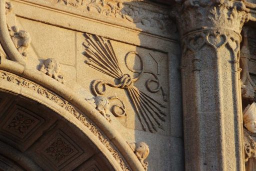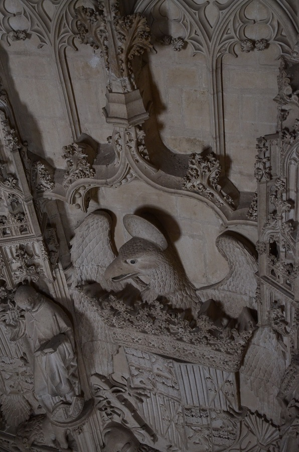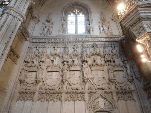El escudo de armas que sostiene el águila nimbada de san Juan evangelista, bajo dos leones afrontados, símbolo de la realeza, contiene en sus cuarteles el león y castillo del reino de Castilla y las barras del reino de Aragón, propietario además del reino de Sicilia, representado en las águilas coronadas. En su parte baja los emblemas del yugo y las flechas. Isabel escogió el haz de flechas, significando la unión de reinos, porque la F era la inicial del nombre de su marido. Fernando, caballero del Toisón de oro, escogió el yugo, con el sentido de unión de fuerzas, porque la Y era la inicial de su esposa. La Y y la F están presentes en las esbeltas y majestuosas tribunas adosadas a los pilares, espacio sin duda reservado para los reyes. La divisa del “Tanto monta” que debía acompañar a su emblema, propuesta por el gran latinista Antonio de Lebrija, alude al legendario episodio de Alejandro Magno llegado a Gordión donde a un yugo atado con un complejísimo nudo se unía la promesa de conquista de oriente. Alejandro lo corta con su espada y proclama: “tanto monta cortar como desatar”, que se traduce como “da lo mismo”. Con esta divisa se hace presente la igualdad de rey y reina en los reinos respectivos.