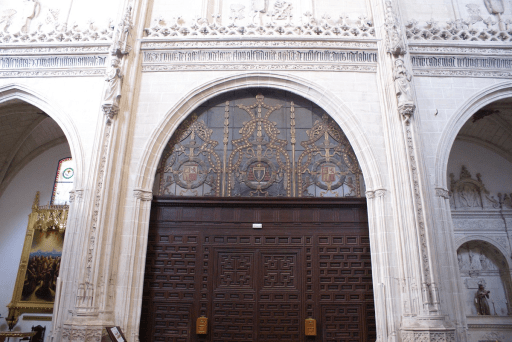 Este espacio, junto con el transepto este (situado enfrente) y el espacio central (situado entre ambos), forman el crucero del templo que en un principio estuvo pensado para ser panteón real (Reyes Católicos). Por ello se decoró abigarradamente a modo de gran tapiz, con imágenes de santos y el escudo de España, de forma repetitiva, en un alarde heráldico que refuerza la imagen de la dinastía. Iglesia. Monasterio de San Juan