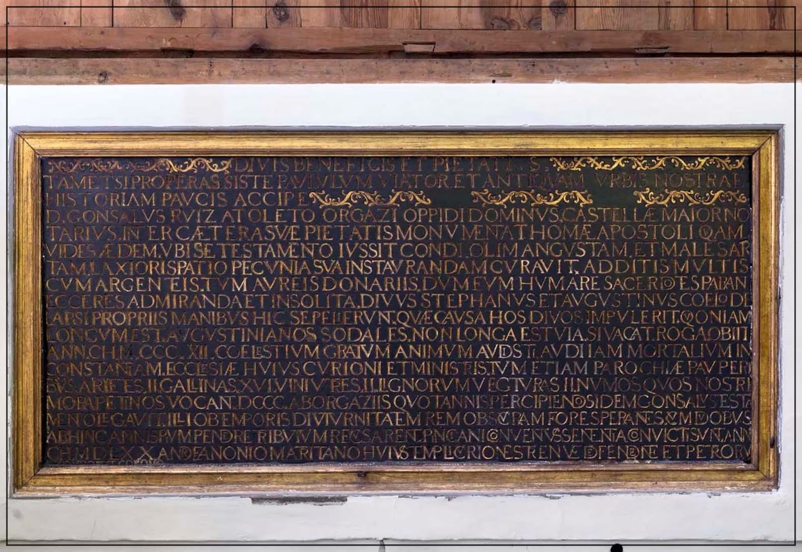 Don Gonzalo Ruiz de Toledo quiso dejar testimonio de su fe de muy diversas maneras. Entre éstas se hallaban ciertas disposiciones testamentarias a favor de esta parroquia de Santo Tomás Apóstol, lugar escogido para su eterno descanso.