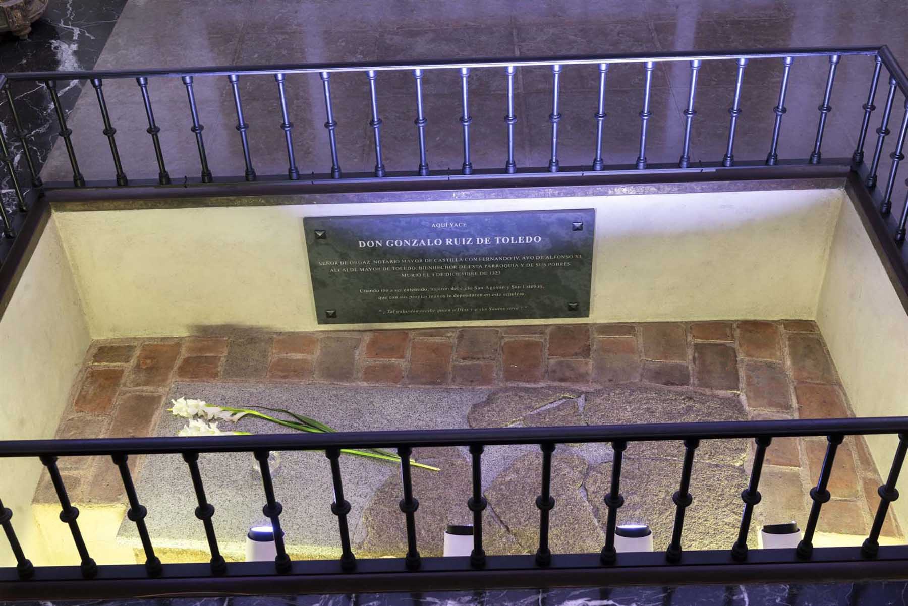 Y delante del cuadro, en el suelo se encuentra el recientemente recuperado sepulcro de Don Gonzalo Ruiz de Toledo, Señor de Orgaz.