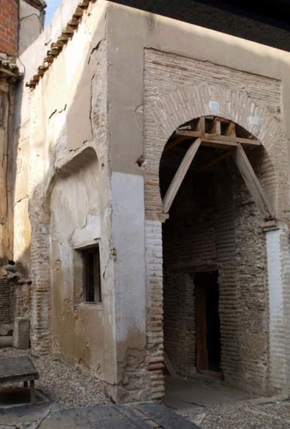 Actualmente se conserva un arco de herradura en el espacio de San Ginés. El mismo da acceso al lugar donde se localizaba la Sacristía. Debemos indicar que éste arco es FALSO! Se corresponde con la rotura de un muro de ladrillo, posiblemente del siglo XV (se puede observar la rotura del muro en el intradós- la parte interna- del arco, donde se ve el paramento de ladrillo roto y sin acabar), mientras que el arco está realizado con una fina capa de mortero o cemento, sobre el que se simuló el paramento de ladrillo. Es decir, es un trampantojo, pero quizá quien lo hizo si había visto la arquería original!