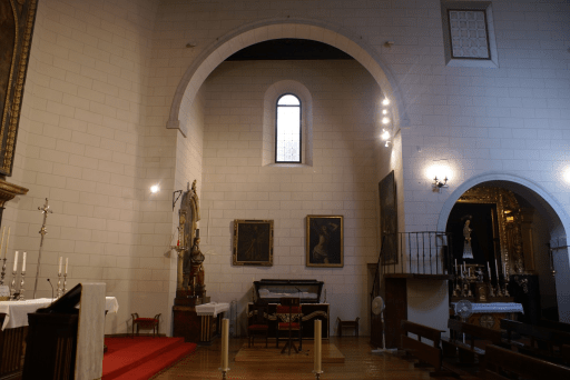 El espacio interior se articula en una amplia nave con ábside poligonal al interior y al exterior y tribuna a los pies, cubierta por armadura de madera. A ella se abren capillas de diferentes tamaños y sistema de cubierta fruto de las sucesivas remodelaciones. Tal es el caso de las situadas junto a la cabecera, dispuestas al objeto de configurar un amplio espacio a modo de transepto, si bien, la que merece especial interés es la que corresponde al antiguo ábside mudéjar, anteriormente citado.