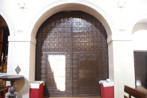 Posee una cúpula sobre pechinas.Tiene decoración de veneras, renacentista y decorada con casetones de flores.