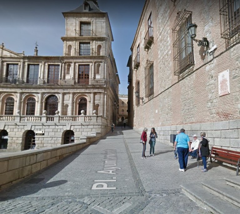 Plaza del Consistorio. Probablemente con anterioridad se llamó plaza del Arzobispo, conjetura de Julio Porres Martín-Cleto en su Historia de las calles de Toledo. Singular la fachada de la casa señalada con el número 2. Esta plaza da entrada al pasaje que la une con la calle de la ciudad, pasaje único en todo el casco histórico de la ciudad. El número 3 de la plaza cuenta con unos extraordinarios elementos mudéjares, se trata del palacio del Conde Esteban; más información en: