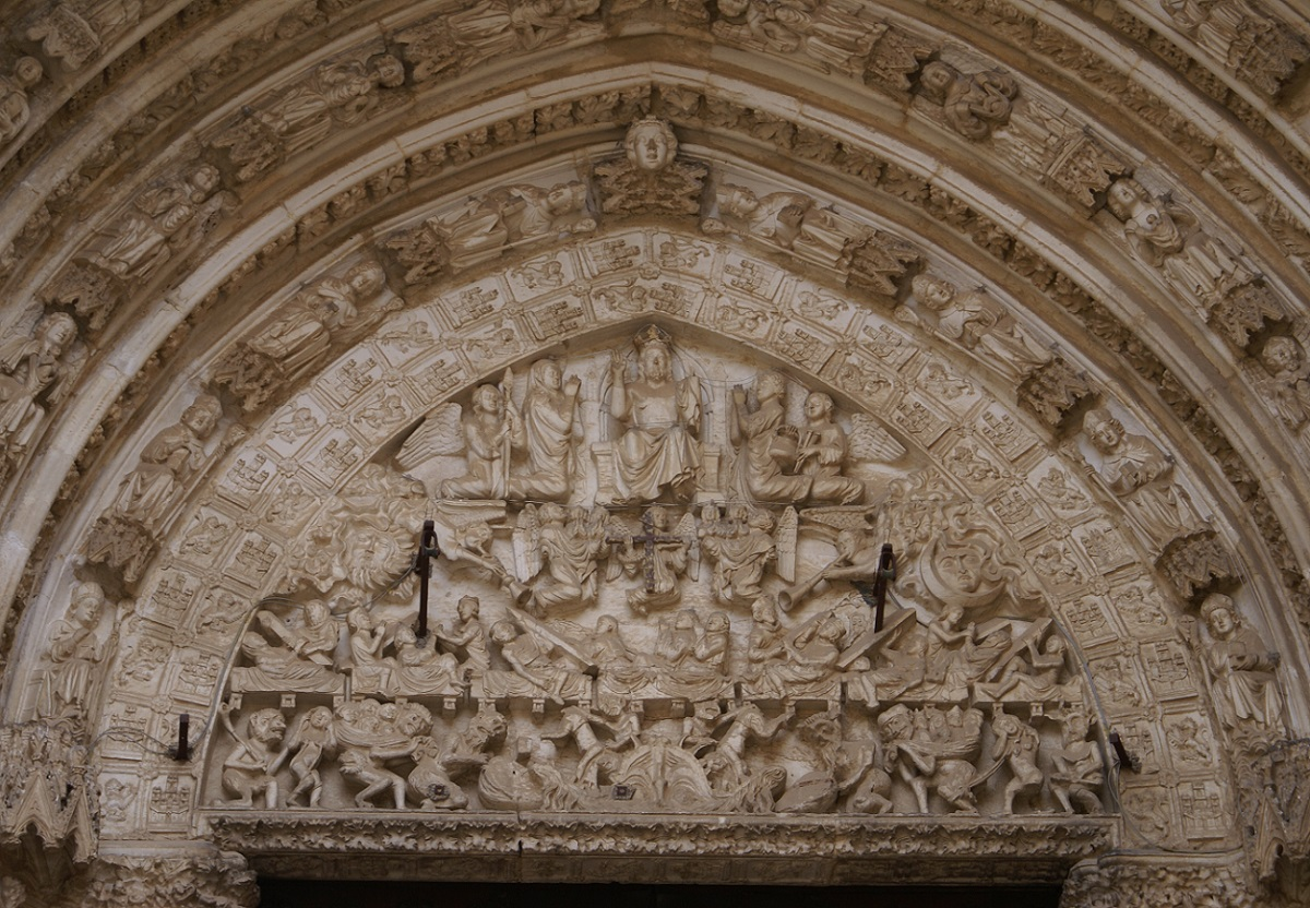 Tímpano de la Puerta del Juicio Final (ca. 1300), también llamada de los Escribanos. La escena del fondo está compuesta por figuras en altorrelieve divididas en tres franjas superpuestas. En la parte inferior se representa el infierno con figuras del bestiario y zooantropomorfas. En la parte intermedia, el mundo terrenal con la resurrección de los muertos. En la parte superior, el mundo celestial con la figura del Juez Dios Padre, en posición sedente, flanqueado de hombres y ángeles.