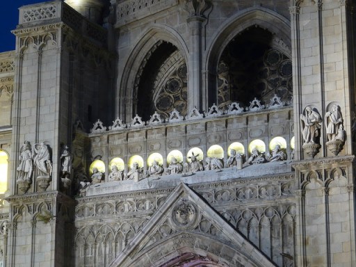 Las jambas é imposta de ella, están labradas con relieves de castillos y leones alternando , y el centro del arco sobre la misma puerta, está ocupado por un medio relieve de mérito bastante regular, que representa el asunto tan repetido por todas partes (como el blasón más glorioso de esta Santa Iglesia) de la Descensión de la Virgen asistida de ángeles para poner la casulla a San Ildefonso. La bóveda de este grande arco, que tendrá por lo menos 12 pies de fondo, se contempla llena de ángeles, Profetas y Patriarcas, formándosela clave con cabecitas de los primeros, todo perfectamente ejecutado, cuyas figuras constituyen las archivoltas con que el arco se vá abriendo, v tiene cada una su correspondiente repisa y doselete de infinita variedad. Sobre este arco se nota un frontispicio triangular que no se puede avenir con el género á que pertenece lo que acabamos de reseñar, y en el centro de este remate del primer cuerpo se vé en un óvalo de piedra, el jarrón con azucenas, símbolo de la pureza de María Santísima á quien el templo está dedicado.
