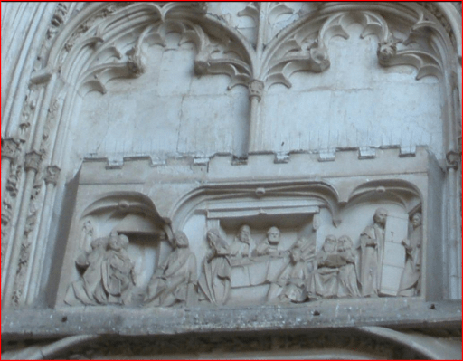 Sobre los dinteles de los dos huecos bajo el tímpano, se relatan dos escenas de la dormición de la Virgen según el relato de los evangelios apócrifos. A la izquierda se representa la reunión de los apóstoles en la alcoba donde yace en la cama la Virgen con el ataúd preparado, mientras que a la derecha, se representa el traslado del féretro al valle de Josefat. En el camino son atacados por el judío Rubén y sus manos se quedan pegadas a la caja. Santo Tomás no puede acudir pero contempla la Asunción desde el Monte Olivete y la Señora le recompensa con su ceñidor. El santo está figurado sobre el doselete de la Virgen del parteluz.