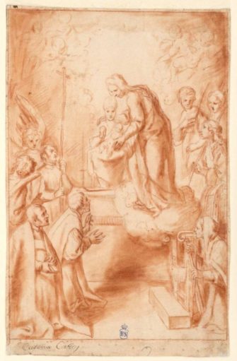 Y, sin embargo, probablemente ninguno de vosotros haya visto nunca una imagen representando a la Virgen abrazando a la imagen del Sagrario. Y tenéis razón, porque hay pocas, tan pocas que yo sólo he sido capaz de encontrar una, un dibujo realizado por el pintor real Eugenio Cajés, uno de los encargados por el cardenal Sandoval para decorar la capilla del Sagrario de la Catedral de Toledo.
