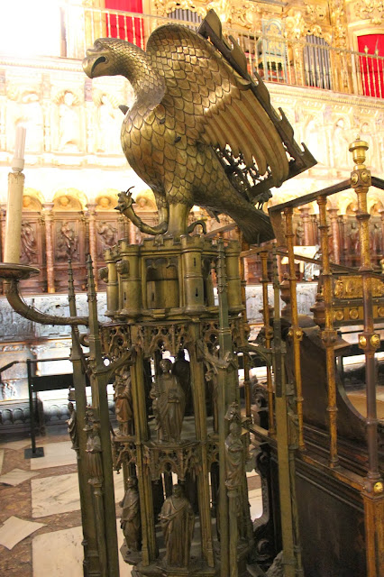 El facistol del centro está formado por un soporte de arquitectura gótica de finales del siglo xv, que sostiene un águila de bronce con las alas extendidas, que fue fundida en 1664 por Vicente Salinas.