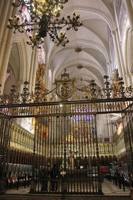 Nos giramos para enfrentarnos con el coro, cuya situación en medio de la iglesia es una característica de las catedrales y basílicas españolas que a mi personalmente me parecen un síntoma de soberbia de esta nuestra iglesia, parece como si las iglesias y catedrales fueran de los curas y no de los feligreses, a los que se mandaba al trascoro ó a los laterales de las mismas y ellos los «todopoderosos» en primer plano, lamentablemente la humildad no fue un signo de distinción de ella ,sino todo lo contrario y así les esta yendo. Olvidaron lo que si habían aprendido nuestros pobres mozárabes en su sumisión de siglos ante el poder musulmán, humildad.