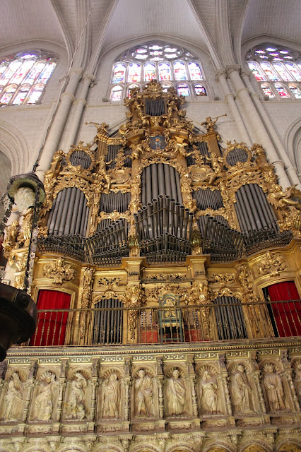 Dos monumentales órganos están ubicados sobre la tribuna del coro. El más antiguo es el del lado de la Epístola llamado también órgano del Coro del Arzobispo. Tiene una caja de estilo churrigueresco cuyo autor es el escultor Germán López. Se terminó de construir en 1758 en tiempos del cardenal Conde de Teba. El ingenio musical es del famoso organero eibarrés afincado en Madrid, Pedro de Liborna Echevarría.