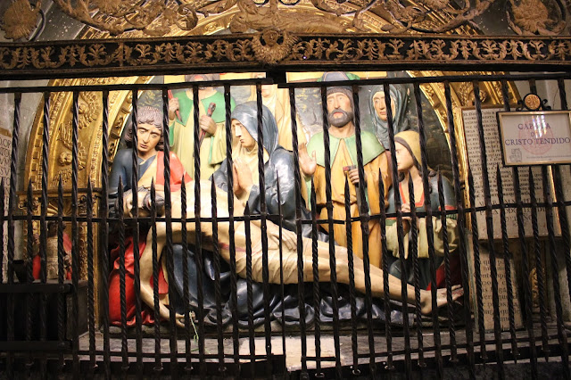 y a la izquierda Cristo Tendido, con un grupo escultórico de Cristo muerto en los brazos de su Madre, una talla de extraordinaria fuerza emocional que se pierde un poco tras los barrotes. Acompañado de las Tres Marías, San Juan, Nicodemo y José de Arimatea. La verja aquí presente representa un árbol genealógico de la Virgen María.