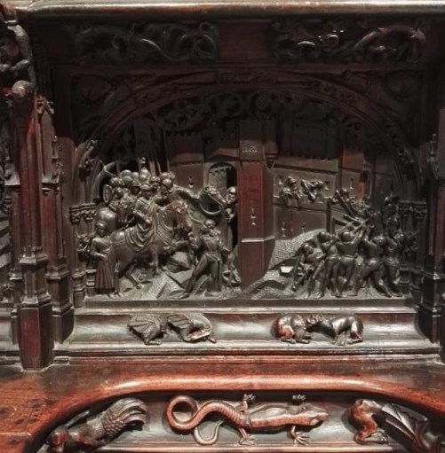 Cincelando en la madera juegos prohibidos en la época, como los naipes y todo tipo de juegos carnales, la lujuria brilla en todas sus vertientes, en baños públicos mixtos que favorecían la lascivia o a través de temas como la de Phipis cabalgando sobre Aristóteles.