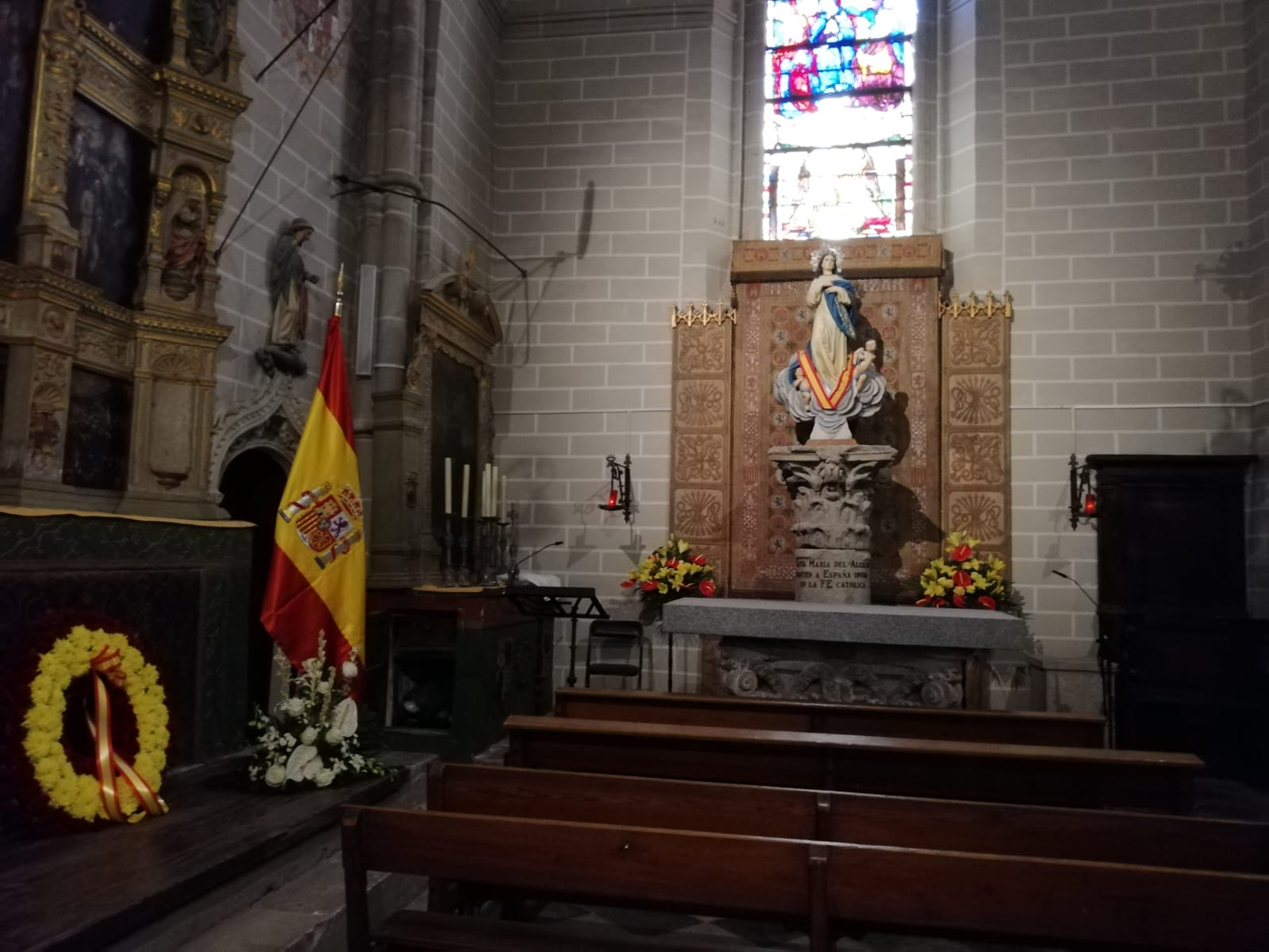 La Capilla se ha mejorado y ya tenemos a la imagen de nuestra Virgen de nuevo en su lugar encima de una columna de piedra del Alcázar donde puede leerse: «Santa María del Alcázar mantén a España unida en la fe Católica».